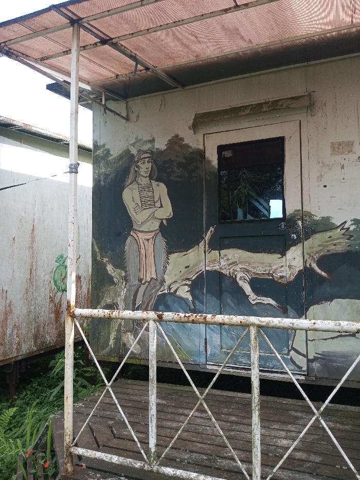 A weathered building features a painting of a Native American man with his arms crossed, wearing a loincloth and a headband. An adjacent door displays a blurry reflection. To the left, another building with faded paint is visible. The foreground shows a rusty, white-painted fence with a crisscross design, leading to a wooden deck. Lush greenery grows beneath the structure. The building is covered by a rusty awning supported by a metal pole.