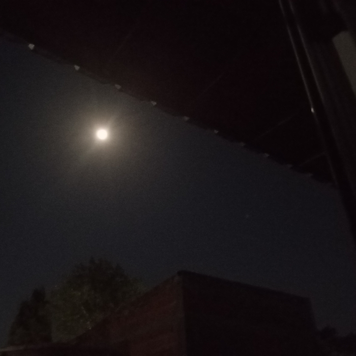 The image displays a nighttime scene in Berazategui, Argentina, viewed from below an overhead structure. A prominent, luminous, spherical celestial body, consistent with the moon, is centered in the upper-left portion of the dark sky. A faint, singular point of light is visible in the mid-right sky. The upper and far-right edges of the frame are occupied by a dark, flat structure, likely a roof or awning, from which a series of small, lighter, triangular or rectangular elements project along its visible lower edge. A dark, thick vertical column or support beam is present on the far right. In the lower-middle and lower-right, a dark, angular building structure is discernible, its edges silhouetted against the sky. Dark, amorphous shapes consistent with tree foliage are visible in the lower-left, partially obscuring the building structure. No people or active events are depicted.