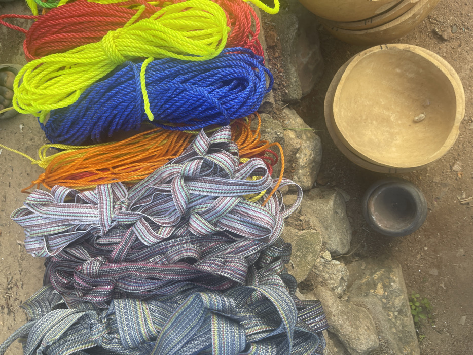 This image presents an overhead view of various goods displayed outdoors. The upper section features an arrangement of textile straps and coiled ropes. On the left, multiple bundles of woven fabric straps are visible, characterized by striped patterns incorporating shades of blue, grey, white, red, and green. To their right, several distinct bundles of coiled synthetic ropes are arranged by color: orange, a prominent blue bundle secured with a yellow tie, bright neon green, and red. A low, unmortared stone wall, composed of irregularly shaped grey and brown rocks, separates these items from the ground level. Below this wall, on reddish-brown earth, a small, dark, circular clay pot is positioned. Adjacent to it on the right are two larger, light-brown wooden bowls, likely calabashes, appearing to be stacked or nested. No individuals are present in the frame, and no specific actions or interactions are depicted. The precise location within Jos, Nigeria, cannot be determined from the visual information provided.