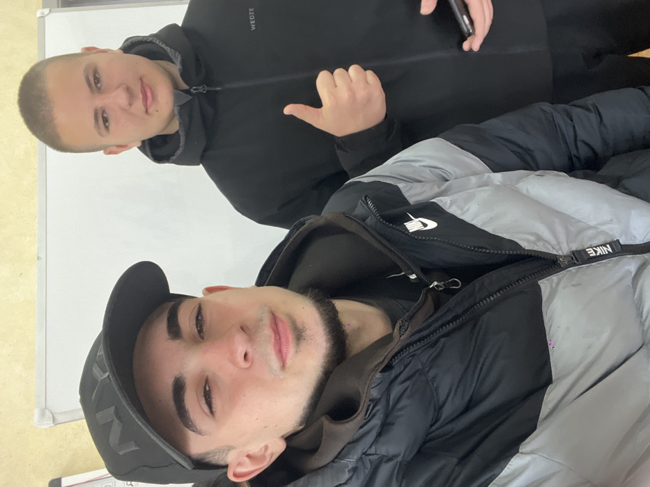 The image displays two males indoors, positioned in front of a light-colored wall with a white rectangular whiteboard partially visible in the upper right background. The male on the left, positioned closer to the camera, has dark hair and a light goatee. He wears a black baseball cap featuring a dark "NY" logo and a black and grey puffer jacket with a white Nike swoosh logo on the left chest and "NIKE" text on the zipper pull. He maintains eye contact with the camera. The male on the right has short, light-colored hair and wears a black hooded jacket with a white "WEDZE" logo on the right chest. He extends his right hand with a thumbs-up gesture and holds a dark-colored smartphone in his left hand, partially visible. He looks towards the camera with a neutral expression. The specific location within the city of Kardzhali, Bulgaria, is not discernible from the provided visual information.