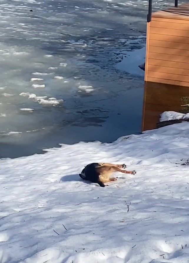 The scene is a snowy landscape, with a body of water mostly covered in ice floes in the background. Adjacent to the water is a wooden platform with a black metal railing. The foreground is dominated by snow-covered ground. A small dog with a brown and black coat and a turquoise harness is present on the snow. Initially, the dog is on its belly but then begins rolling around in the snow, eventually ending up on its back with its legs up. The lighting suggests it is daytime, with clear skies overhead. In the distance, bare trees can be seen, adding to the wintry feel of the location.