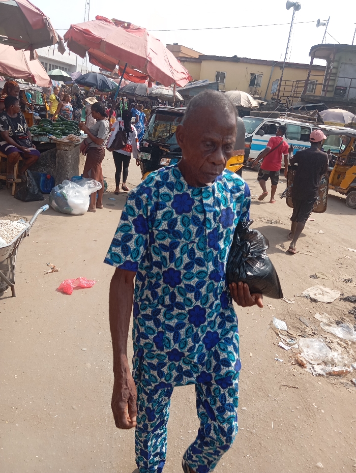 An elderly man walks through a busy market, carrying a black plastic bag. He is wearing a matching blue and white patterned outfit. Surrounding him are various market vendors, customers, umbrellas, and vehicles. The ground appears sandy and littered with debris. Other people are walking, and some are standing by stalls. The overall scene suggests a typical day at a bustling African market.