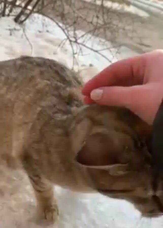 person interacting with a cat in a snowy outdoor setting. The person is wearing a black jacket and has manicured fingernails. They are reaching out to pet a tabby cat with tan and brown stripes. The cat is standing on the snow and allows the person to pet it on the head and back. There are bare bushes and a building visible in the background. The ground is covered in snow, suggesting it is winter.