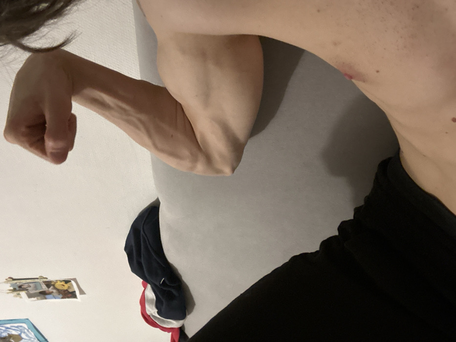 An indoor photograph captured in Villaz, Switzerland, depicts a partial view of an individual's upper body. The subject, likely male, is shirtless and reclined or seated on a light grey upholstered sofa. The right arm is flexed at the elbow, with the hand forming a fist, showcasing the bicep and forearm muscles, characterized by pronounced vascularity. The right side of the subject's bare chest, including the nipple, is visible. Dark hair extends into the upper right corner of the frame. The lower body is partially obscured but appears to be clad in dark trousers or shorts. To the left of the subject, a dark blue garment with red and white stripes is folded on the sofa. The background consists of a plain white wall, adorned with two small framed photographs secured by clips on a suspended string.
