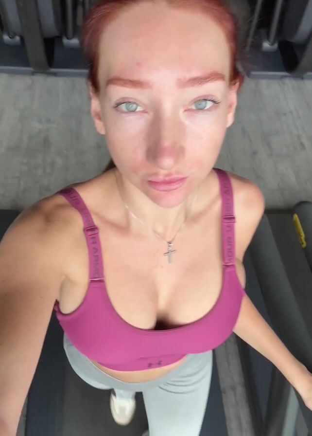 A woman is walking on a treadmill. She is wearing a pink sports bra and light gray leggings. She has red hair and is wearing a silver necklace with a cross. The treadmill is in a gym, and other treadmills can be seen in the background. She is holding her phone up to film herself. The camera angle changes from her face to her chest and waist.