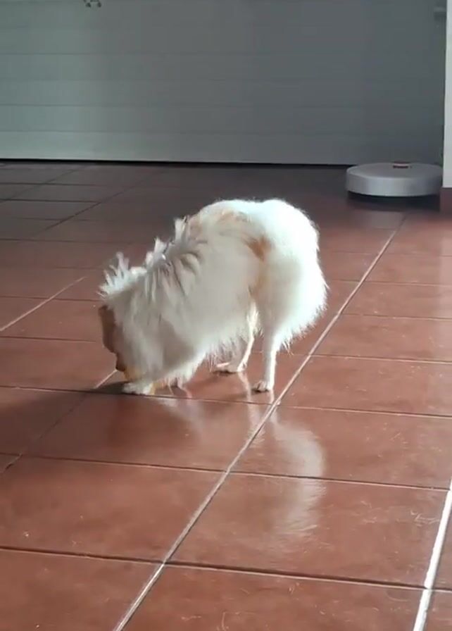 small, long-haired dog playing with a yellow ball on a tiled floor. The dog is predominantly white with some light brown markings. It picks up the ball, moves around, then drops it, appearing to look expectantly at the camera. The background includes a white garage door and a robotic vacuum cleaner. The floor is covered in brown, square tiles with visible grout lines. The room is well-lit, casting soft shadows.