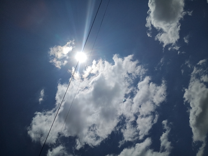 The scene captures an upward perspective of the sky in Chitungwiza, Zimbabwe, under bright daylight conditions. The sky is predominantly deep blue, populated by scattered cumulus clouds ranging in color from white to light grey. The sun, a brilliant white orb, is positioned in the upper right quadrant, partially veiled by a cloud and generating a strong lens flare. Two dark, parallel utility lines are visible diagonally spanning the frame from the upper left to the lower right, crossing in front of the sun and clouds. No individuals, ground-level structures, or actions are depicted.