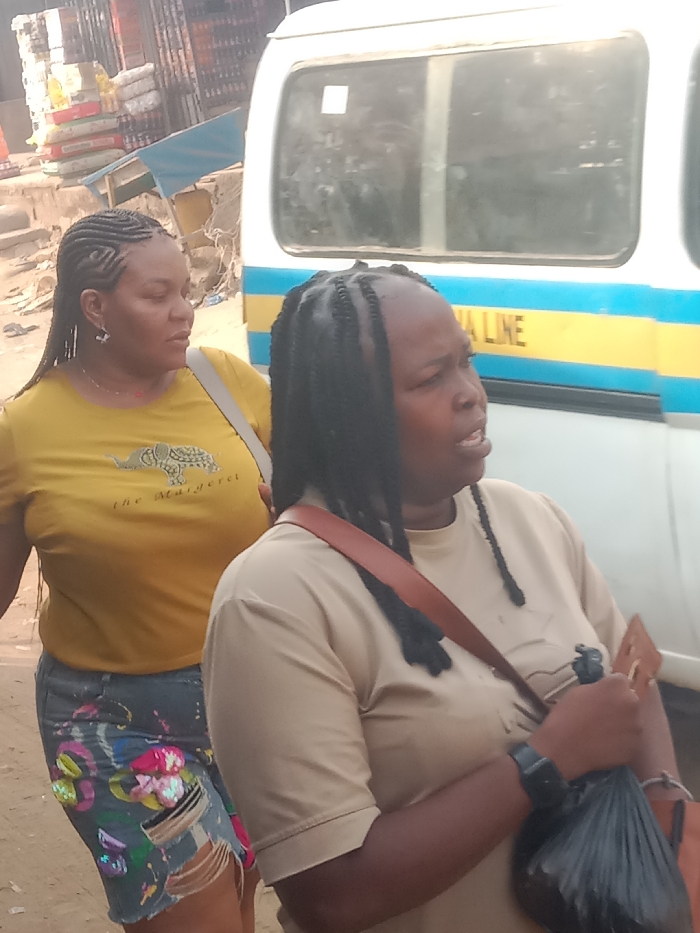Two adult females are positioned on a dusty street in Onitsha, Nigeria, with a white commercial minibus in the background