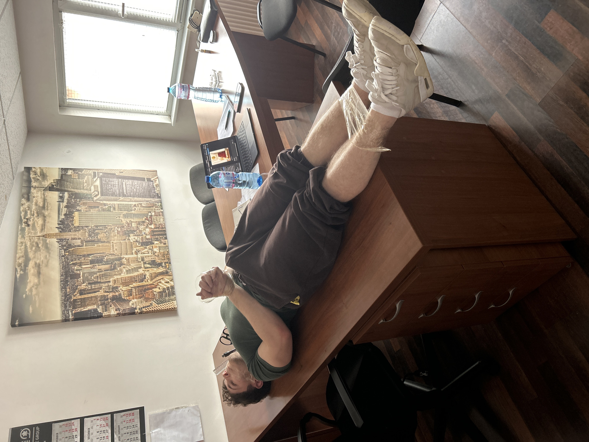 A man lies on a desk, resting his legs on another desk. He wears white sneakers. His hands are wrapped together in clear plastic wrap. The desks are wooden. A laptop, glasses, and water bottles sit on one desk. An office chair sits nearby. A city-themed print hangs on the wall. A calendar is attached to the wall. Wood-look flooring covers the floor. The photo was likely taken in an office, although the location in Rogosh, Bulgaria is not discernible.