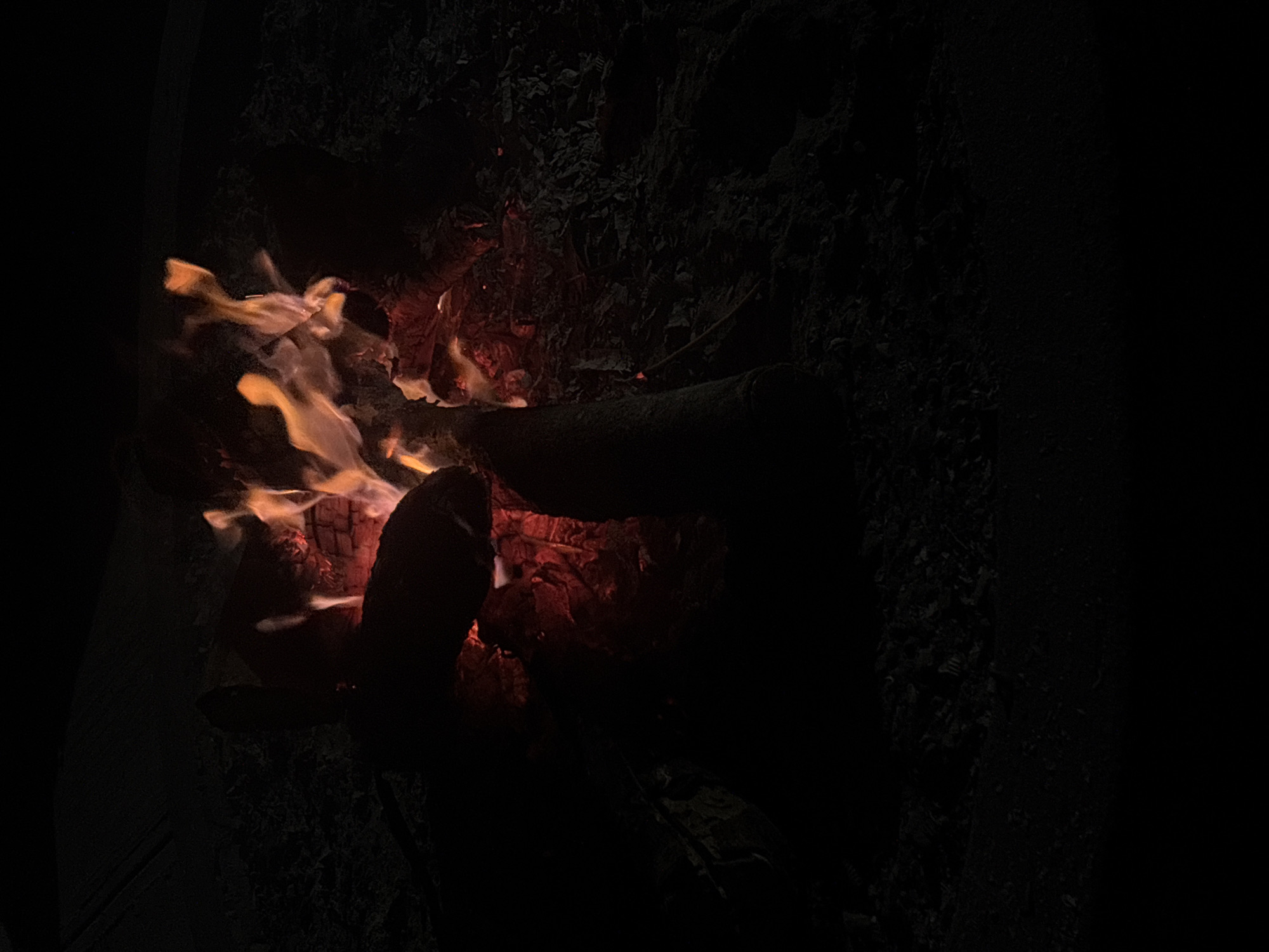 A dark, low-light image captures a fire burning in an outdoor setting. The flames are visible, illuminating logs and ash. The precise location is not discernible in this image. No people are visible. The fire appears to be contained within a fire pit or designated area. The surrounding environment is largely obscured by darkness.