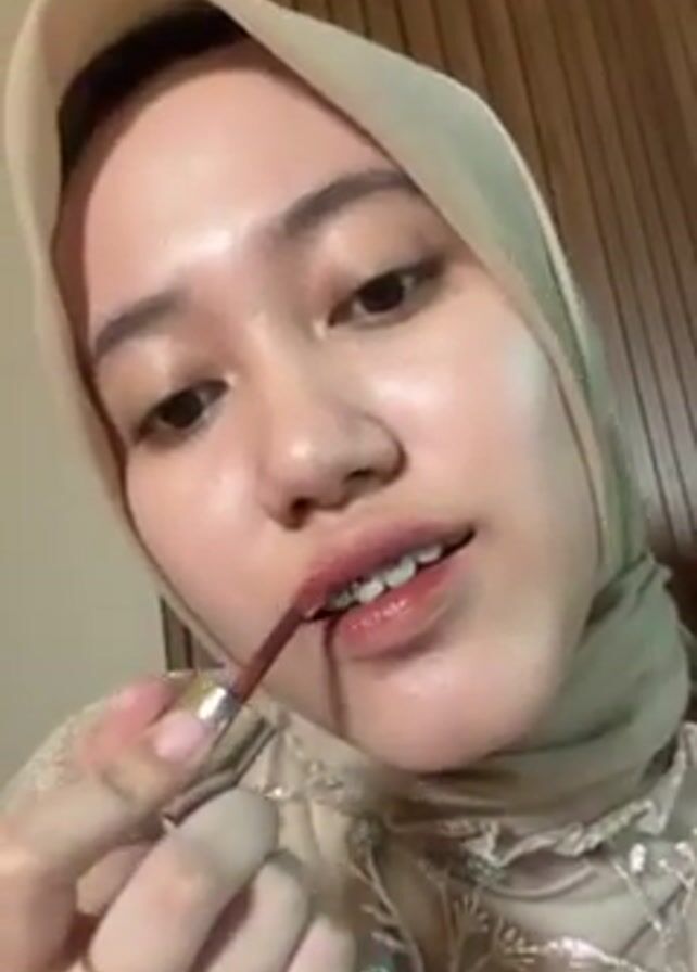 A woman wearing a light beige hijab and a matching lace-trimmed top is applying a reddish-brown lip product with a gold-colored applicator