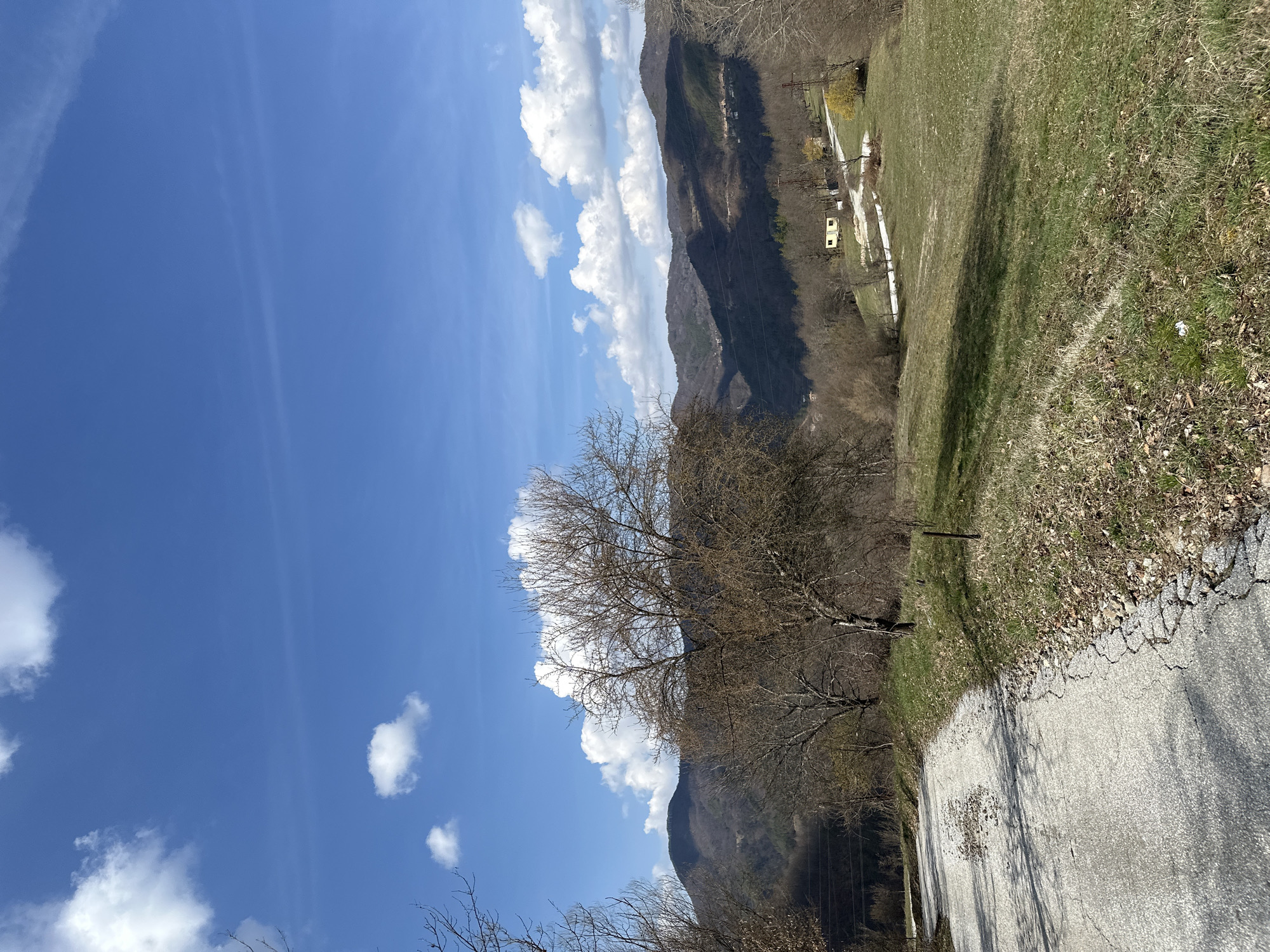 The image presents a rural landscape in Borinovo, Bulgaria, under a clear blue sky dotted with scattered white cumulus clouds. The scene is illuminated by bright daylight, suggesting late winter or early spring conditions. In the foreground, a damaged asphalt road with extensive cracking, potholes, and loose gravel occupies the left side, exhibiting shadows cast from the left. To the right of the road, a grassy embankment with patches of dried leaves and nascent green growth ascends. The midground is dominated by rolling hills covered in sparse vegetation, featuring numerous deciduous trees, largely bare of leaves. Utility poles supporting power lines are visible, extending across the landscape. In the distance, on a lower hill, a small, light-colored rectangular building with a darker roof is observed, connected by a winding dirt or gravel road. The background consists of multiple layers of mountains, characterized by forested slopes appearing dark green and brown, with variations in light and shadow. No individuals or discernible activities are present in the frame.