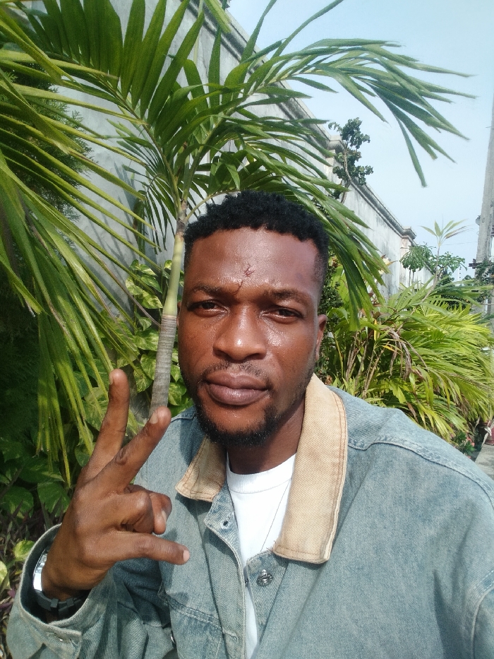 The image depicts an adult male posing outdoors in Ado, Nigeria, under clear daylight