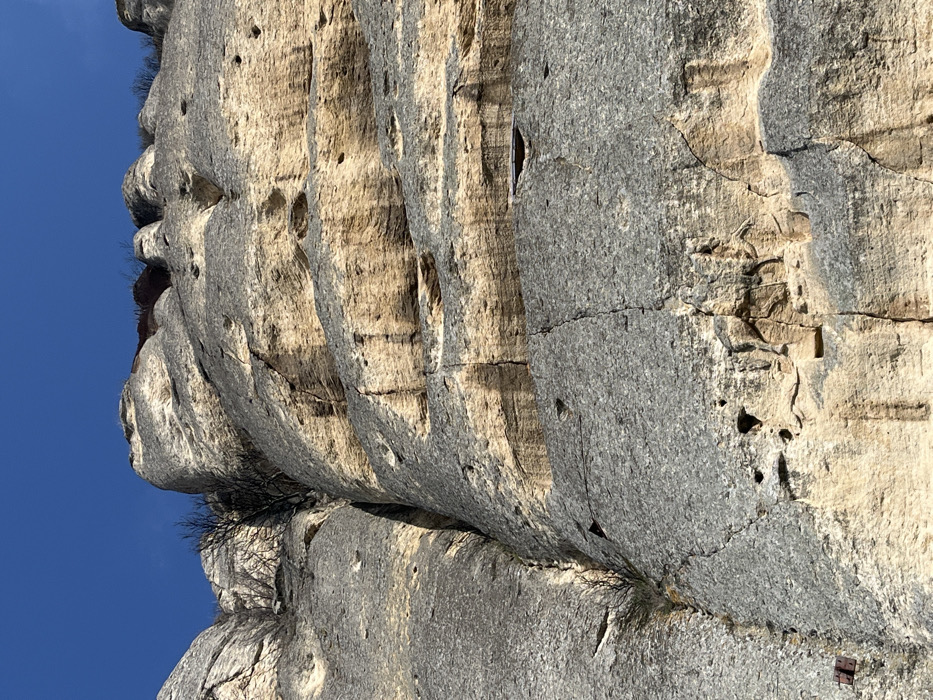 The image displays a towering rock face, characterized by varying tones of grey and ochre, located in Madara, Bulgaria. The geological formation exhibits extensive natural fissures, pronounced horizontal stratification, and numerous erosional cavities across its surface. Sparse, deciduous vegetation is observed growing from several crevices, particularly along a prominent vertical crack on the left. Prominently carved into the lower-central right section of the rock is the Madara Rider relief, depicting a horseman, a dog, and a lion. A small, dark, rectangular object is affixed to the rock on the lower-left side. The scene is presented under a clear, deep blue sky, with direct sunlight casting shadows that accentuate the rock's texture and depth. No individuals are present, and no discernible actions or interactions are occurring.