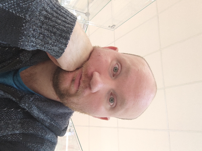A close-up portrait shows an adult male with a bald head and a reddish-brown beard, staring directly forward with wide, light-colored eyes