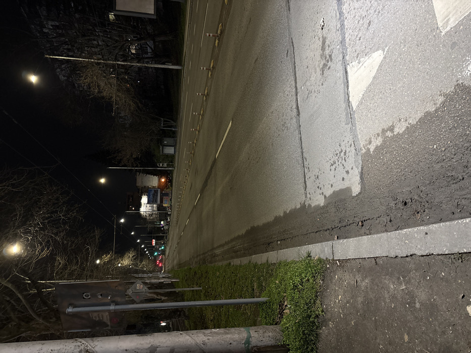 This image depicts a nighttime urban street scene on Bul. Vasil Levski in Varna, Bulgaria. The scene is illuminated by numerous streetlights, casting a yellowish glow on the asphalt road and surrounding environment, contrasting with the dark night sky. In the immediate foreground on the left, a large, cylindrical utility pole occupies the extreme edge of the frame. Adjacent to it, a narrow strip of sparse green grass borders a concrete curb, beyond which a distinct dirt line traces the edge of the road. The asphalt road surface appears damp in sections, particularly near the curb and across a discernible pedestrian crosswalk marked by fading white paint in the foreground. The road itself is a multi-lane thoroughfare, with at least two lanes visible heading into the distance, delineated by clear white painted lines. A central median separates the traffic flow, marked by a series of uniformly spaced, short, flexible bollards with red and white reflective stripes. Overhead, trolleybus wires are discernible against the dark sky. Along the left side of the road, a row of deciduous trees with bare branches extends into the background. Several metal poles stand among these trees; one pole in the midground features an unidentifiable, dark rectangular sign. On the right side of the street, further down, structures consistent with a bus stop shelter are visible, along with multiple billboards. Distant traffic lights glow green, indicating clear passage. Buildings are vaguely visible in the background on both sides, with some upper floors faintly lit on the right. No individuals or active vehicles are present in the frame, indicating low traffic activity at the time of capture.