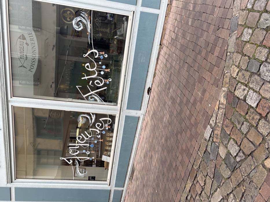 The image depicts a street-level view of a storefront for a fishmonger, likely located in Le Puy-en-Velay, France. The building's facade around the display windows is painted a light teal or blue-green with white trim. The two large glass windows are decorated with white script spelling "Joyeuses Fêtes" (Happy Holidays), accompanied by drawn festive ornaments in blue and orange-red hues. Through the windows, the interior of the shop is visible, featuring shelves stocked with various products such as bottles, jars, and packaged goods. In the upper right window, the reflection of a sign bearing a stylized fish logo and the text "FARGEAU POISSONNERIE" (fishmonger) confirms the shop's business type. A gold fleur-de-lis symbol is also visible on the right window. Reflections of an opposing building, including windows and structural elements, are discernible in the glass. The ground directly in front of the storefront consists of two distinct paving types. In the immediate foreground, a section of multi-colored, irregular cobblestones is present. Adjacent to this and extending towards the building is a path made of reddish-brown rectangular paving stones arranged in a stretcher bond or herringbone pattern. A narrow drain grate is visible at the base of the storefront, where the paving meets the building. No individuals are visible in the scene.