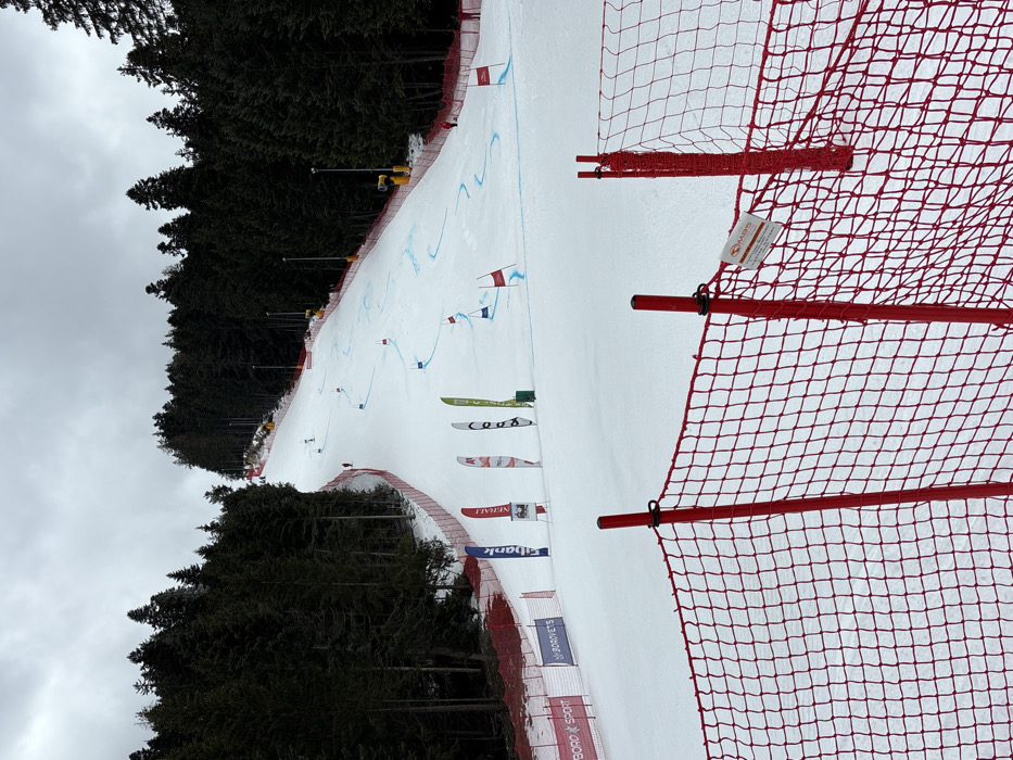 An outdoor scene depicts a snow-covered ski slope ascending sharply under an overcast sky, flanked on both sides by dense evergreen forests