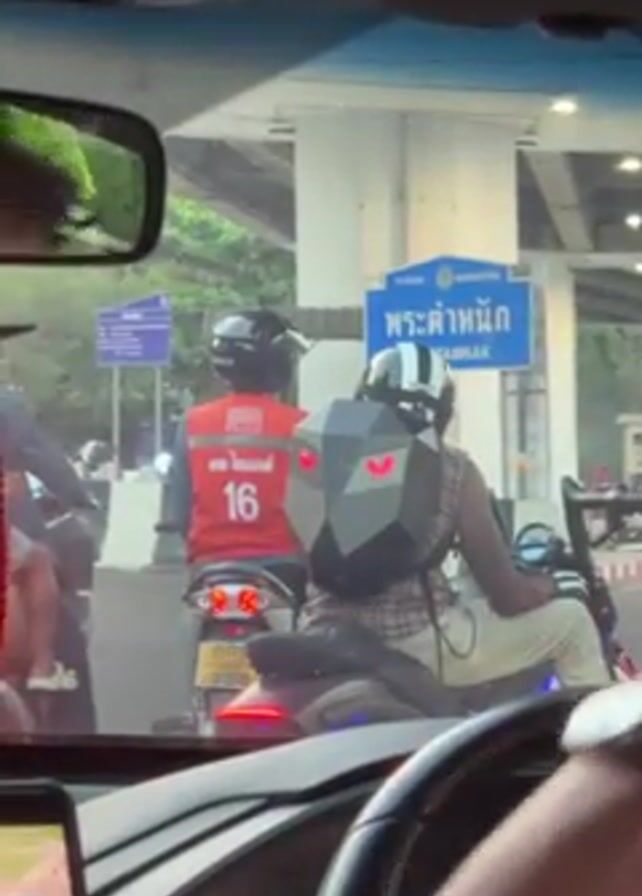 From inside a car stopped in traffic, the video shows two people on separate motorbikes in front. The motorbike on the left has a rider wearing a red vest with the number 16 on the back. The motorbike on the right has a rider wearing a gray, geometric backpack that has two red lights in the shape of eyes. A sign is in the background above the motorbikes that reads “PRA TAMNAK.” The car’s steering wheel and partially visible dashboard are in the foreground.