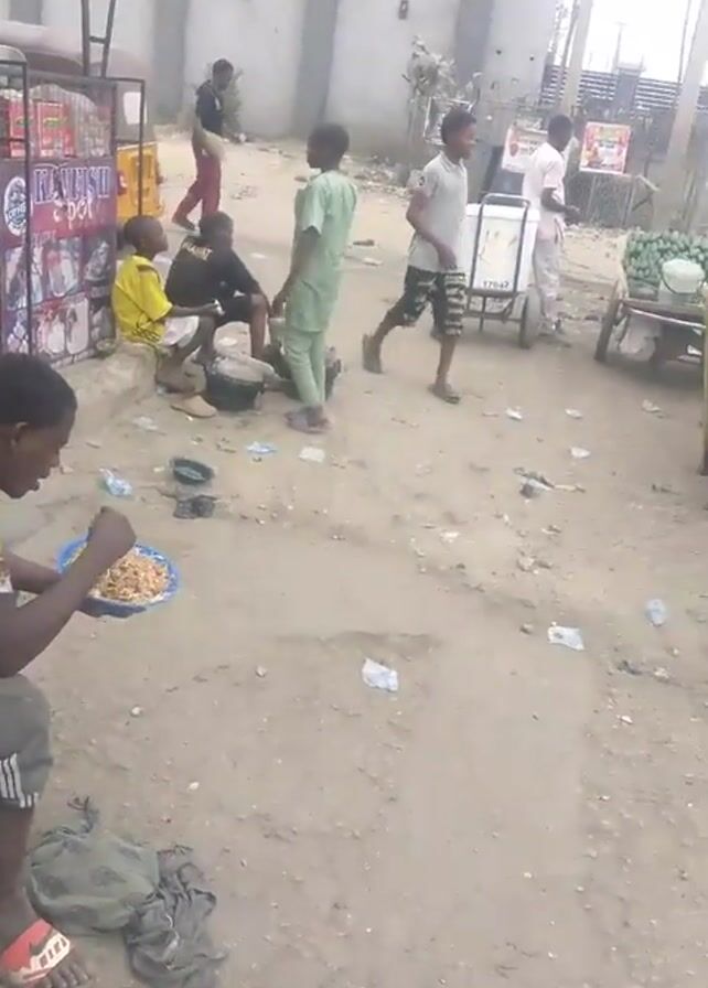 dusty street scene with several people and activities occurring. In the foreground, a man is sitting and eating from a blue plate. Several young boys are standing nearby, some near a makeshift food stand. In the background, there are people working around a cart loaded with watermelons, and another person pulling a small cart. A church sign is visible on a pole in the background. The ground is littered with trash.
