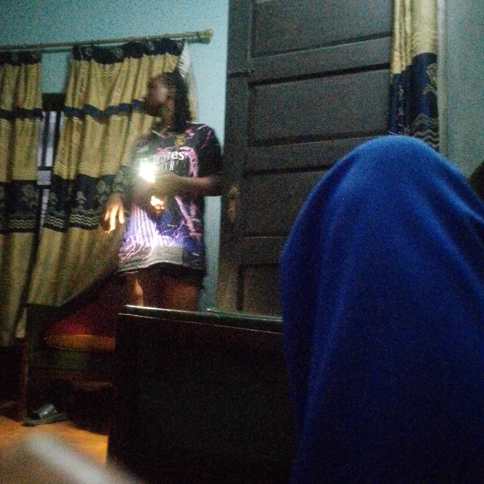 The scene depicts an indoor domestic environment in Umuoji, Nigeria, under low ambient light conditions. In the midground, a standing individual with dark hair, wearing a dark graphic t-shirt with a light-colored design and dark shorts, holds an illuminated rectangular object, consistent with a smartphone screen, directly in front of their torso. The light from this object illuminates their hands and upper body. Their head is tilted slightly back, and their gaze appears directed towards the light source. To the left of the individual, a dark piece of furniture with a red cushion is partially visible. The background features a light blue wall on the left, adorned with two sets of drawn beige curtains featuring dark patterns. To the right of the individual is a dark brown wooden paneled door with a light-colored doorknob. In the foreground, an indistinct mass draped in royal blue fabric occupies the right side of the frame, and a light-colored, out-of-focus object is visible at the bottom left.