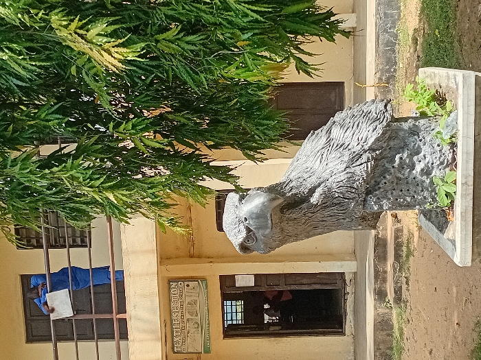 The image captures an outdoor scene at an educational institution building in Lokoja, Nigeria. In the foreground, a dark grey, textured statue of a raptor-like bird, possibly an eagle, stands on a cylindrical, textured pedestal with circular indentations. The bird faces slightly left and upwards, displaying a stern expression and prominent beak. This statue is set within a light-colored concrete planter box, from which small green plants emerge. The ground around the planter is unpaved, consisting of reddish-brown dirt with sparse green vegetation. The midground features a two-story building with light-colored, possibly cream or beige, walls. On the ground floor, a partially open double wooden door serves as an entrance, accessible via concrete steps. To the left of this door, a rectangular sign is affixed to the wall. The sign has a white upper section and a green lower section. The prominent top text reads "TEXTILE SECTION," followed by smaller text indicating "A DEPARTMENT OF FINE & APPLIED ARTS" and "CREATIVITY & ENTREPRENEURIAL SKILLS," accompanied by textile-related graphics. Another closed wooden door is visible further to the right on the ground floor. On the first floor, a balcony runs across the building, fronted by dark brown metal railings. A dark wooden door and a window with bars are visible on this level. A male individual, dressed in a long-sleeved royal blue uniform or jumpsuit, is standing on the balcony. He is leaning against the railing, looking downwards, and holding a white rectangular sheet or object, which he appears to be examining. A large tree with abundant, elongated, dark green pendulous leaves occupies the upper right portion of the frame, partially obscuring the building's upper facade. The scene is brightly lit by natural daylight.