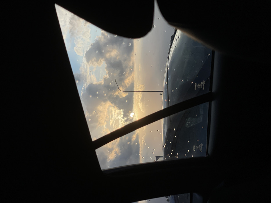 The image displays an exterior scene from inside a vehicle in Herzliya, Israel, at either sunrise or sunset. The internal view is framed by dark car interior elements, including the window border, a central pillar, and a portion of a seat headrest on the right. The car window is covered with numerous clear water droplets, indicating recent precipitation. Through the wet glass, a sky with prominent cumulus clouds illuminated by the low sun is visible, showcasing golden and blue tones. The sun appears as a bright, circular orb in the mid-left, partially obscured by clouds. A tall, dark street light with a curved arm is silhouetted against the sky, positioned to the right of the sun. Directly in front of the viewer's vehicle, the wet roof, rear window, and upper side panel of another dark-colored vehicle, likely a sedan, are visible. The rear window of this vehicle displays several stickers or markings, including what appears to be the word "TOYOTA" in reverse. No individuals or specific actions are discernible.