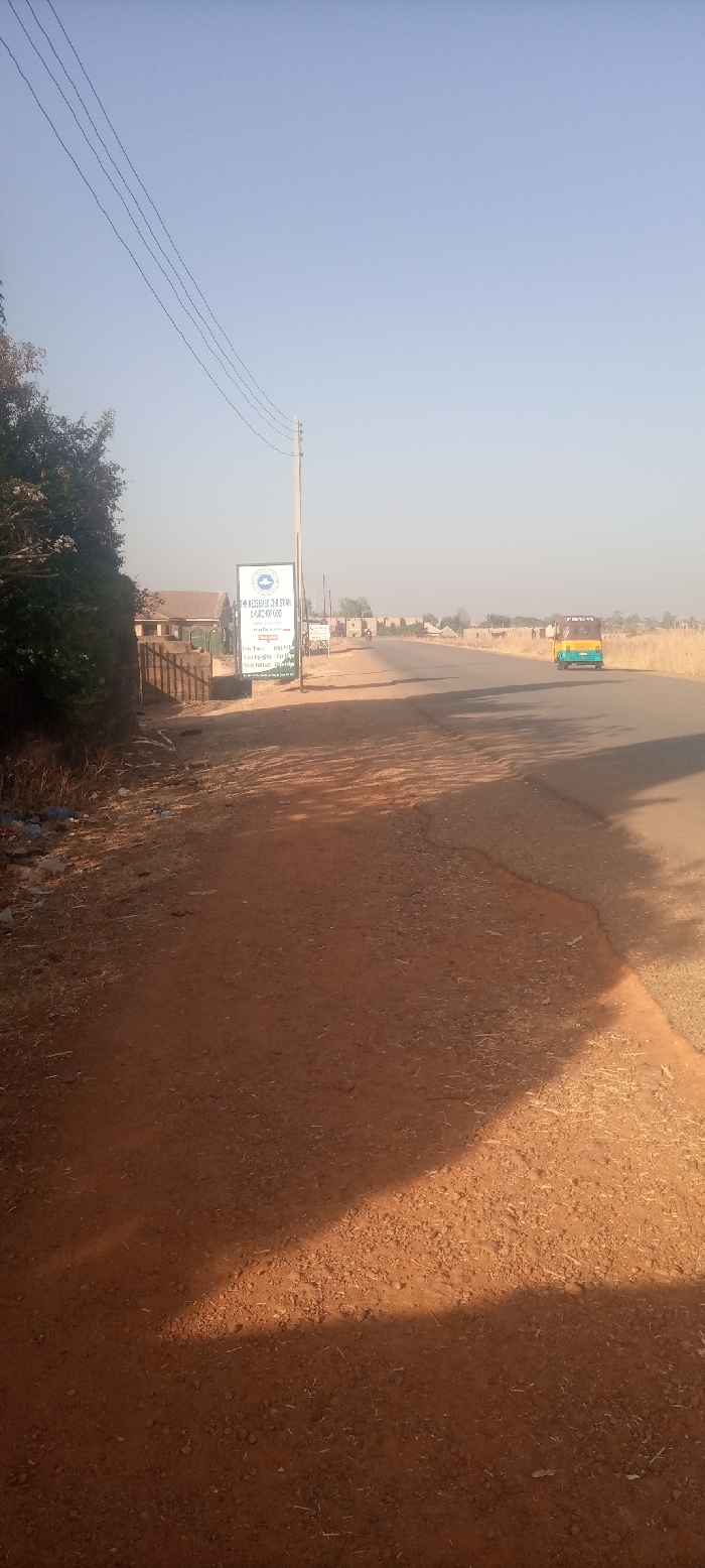 A rural road stretches into the distance under a hazy sky. Vegetation flanks the left edge, with a signpost and utility pole beside it. Buildings line the roadside further along, culminating in a small, open vehicle on the right. The foreground is a dirt verge with shadows cast across it. Wires extend across the sky from the pole.
