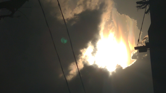 The image displays an outdoor scene over Longuo 'A', Tanzania, characterized by a heavily clouded sky during either sunrise or sunset. A powerful, brilliant white and yellow light source, consistent with the sun, radiates through a large irregular opening in dense, dark grey and black clouds positioned centrally in the frame. The edges of the clouds immediately surrounding this aperture glow with bright yellow and orange hues. Two dark, horizontal lines, identified as overhead power or communication cables, are visible in the upper-middle portion of the sky, spanning across the cloud formations. A distinct green circular lens flare is present in the upper sky, slightly to the right of the image's vertical center. The lower portion of the image features a dark, silhouetted rooftop or structure. From this silhouette, a vertical utility pole or antenna mast, accompanied by multiple entangled wires, rises slightly to the left of the frame's center. Another smaller, dark, silhouetted object, possibly a damaged tree branch or additional utility component, is visible on the far right. No individuals or discernible actions are present within the scene.
