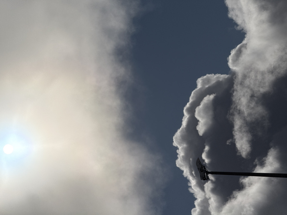 The image displays a daytime sky over Kirovsk, Russia, dominated by cloud formations and a visible sun. In the upper left quadrant, a bright, overexposed sun is partially obscured by a layer of diffuse, light-colored clouds, casting a soft illumination. The upper and lower right sections reveal a darker, deep blue sky. A substantial mass of dense, volumetric cumulus clouds occupies the mid-to-lower portion of the frame, exhibiting distinct shadowing with tones ranging from bright white on sunlit edges to dark grey. A single, dark-colored street lamp pole, slender and vertical, originates from the lower-left-center and extends upwards, topped by a multi-lamp fixture positioned against the darker cumulus clouds. No people, vehicles, or ground features are visible.