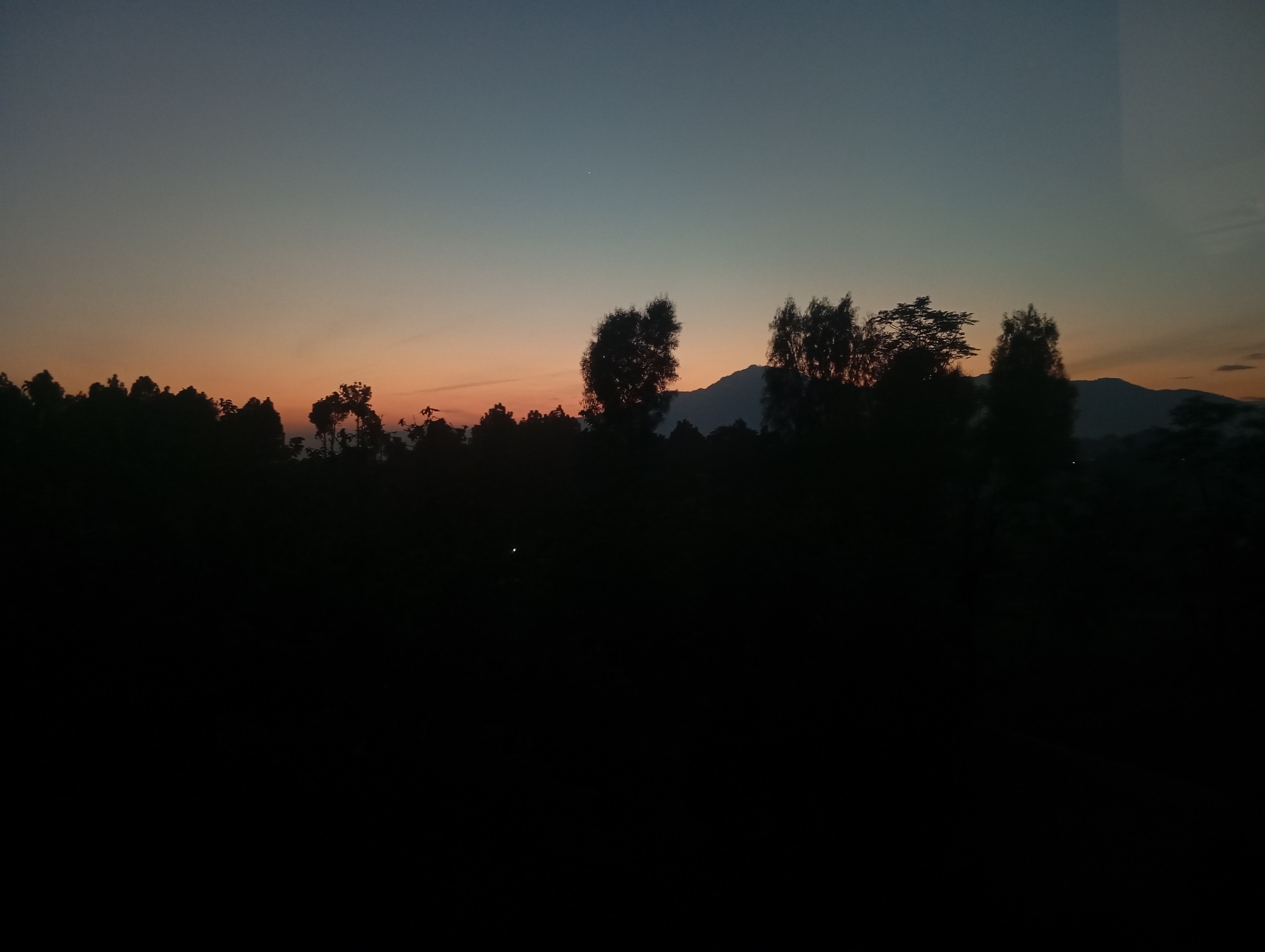 The image presents a landscape at dusk, with a gradient sky transitioning from orange to blue. Silhouettes of trees and vegetation occupy the midground, creating a stark contrast against the colorful sky. A mountain range is faintly visible in the background. The foreground is a solid black area, suggesting darkness. No people or discernible objects besides the natural elements are visible in the scene. The location provided is Lassan, Pakistan.