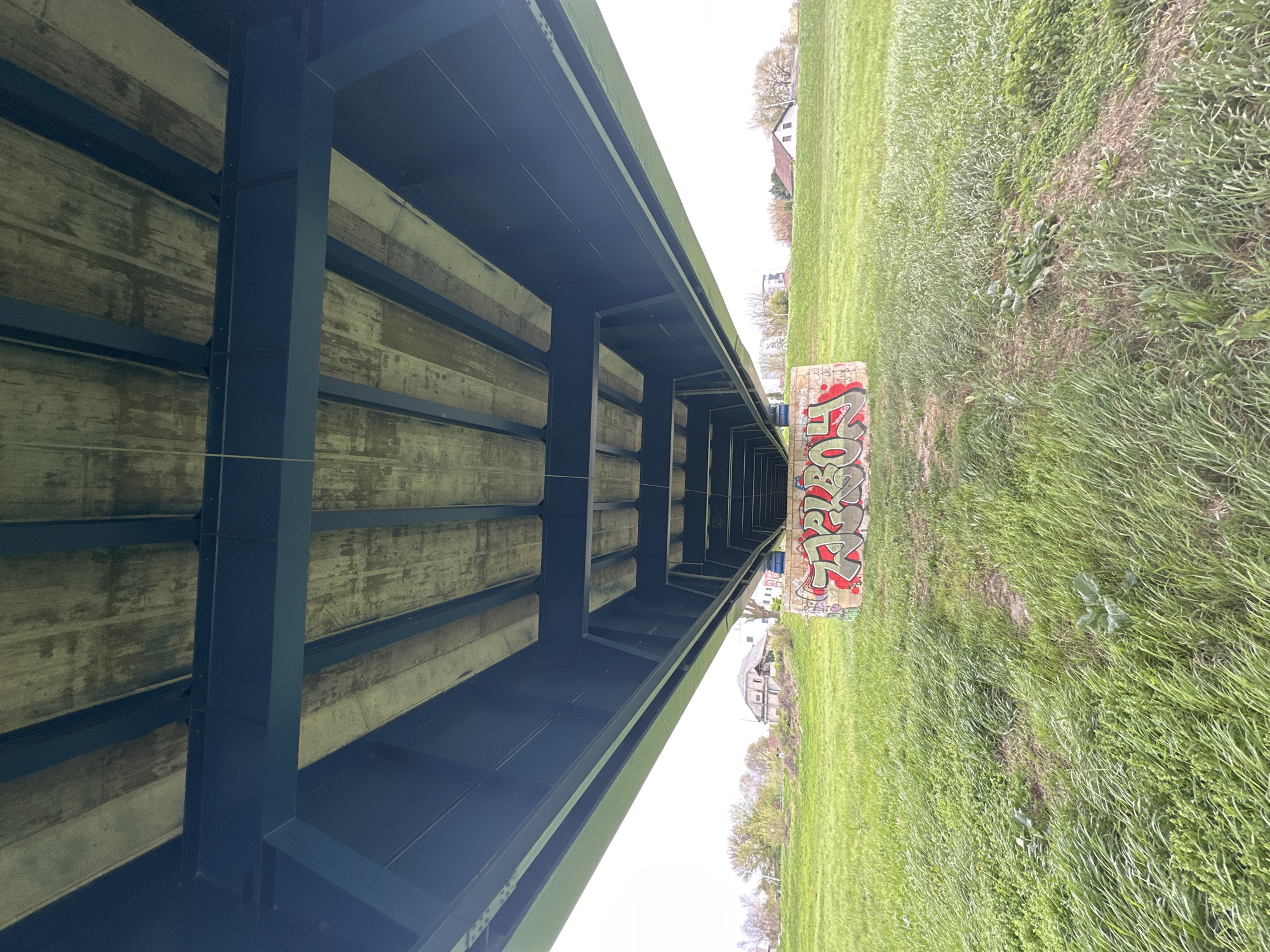 The image depicts the underside of a bridge, potentially a railway or road bridge, in what appears to be the City of Zagreb, Croatia, judging by the architectural style of the houses faintly visible in the background. The bridge is constructed with concrete slabs reinforced by a steel frame, painted a dark blue or grey. The underside of the bridge shows signs of weathering and possible staining. To the right of the bridge structure is a grassy area. A block, potentially a concrete barrier, stands upright in the grass, covered in graffiti. The graffiti appears to be stylized lettering with red and grey colors. The grass is green and appears to be recently mowed.