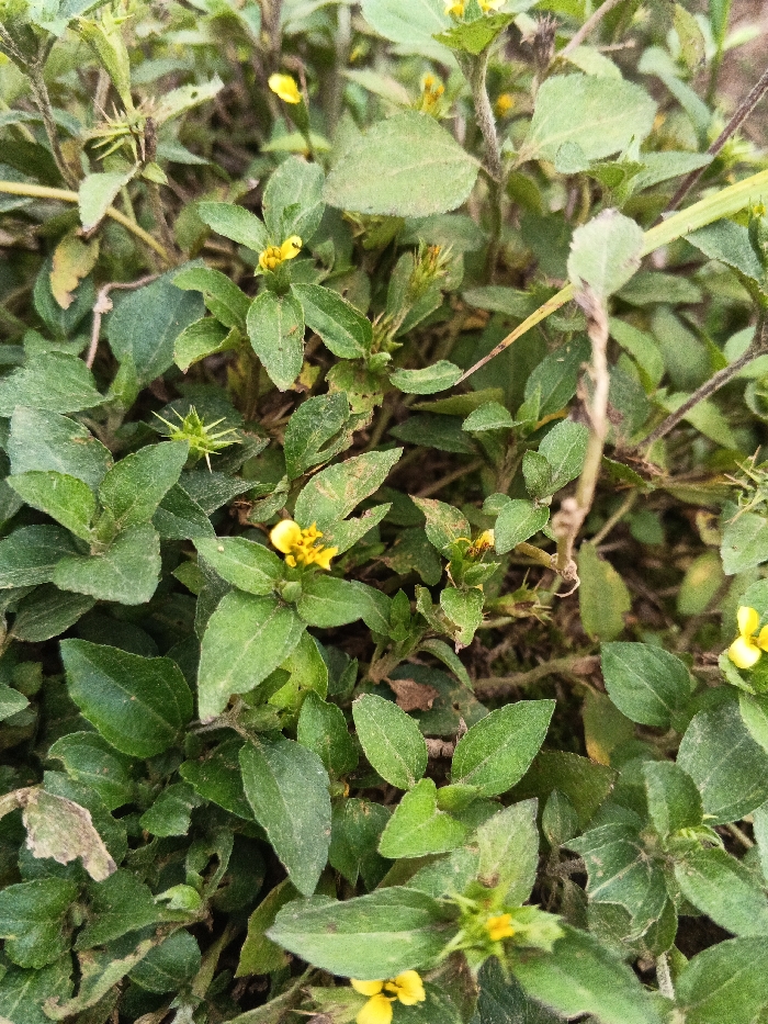 The image presents a close-up, ground-level view of a dense patch of green herbaceous vegetation located in Pinnwe, Myanmar (Burma). The scene is dominated by numerous small plants featuring elliptical to oval-shaped green leaves. Scattered throughout the foliage are multiple small, bright yellow flowers, each typically exhibiting four petals. Several flowers are in various stages of bloom, with some appearing as buds. Interspersed among the green leaves and yellow flowers are distinctive spiky, star-shaped structures, which appear to be either developing seed pods or immature flower heads. The overall growth is dense, largely obscuring the ground beneath, and includes a few thinner blades of grass or similar linear plant material. No animate subjects or human objects are visible within the frame.