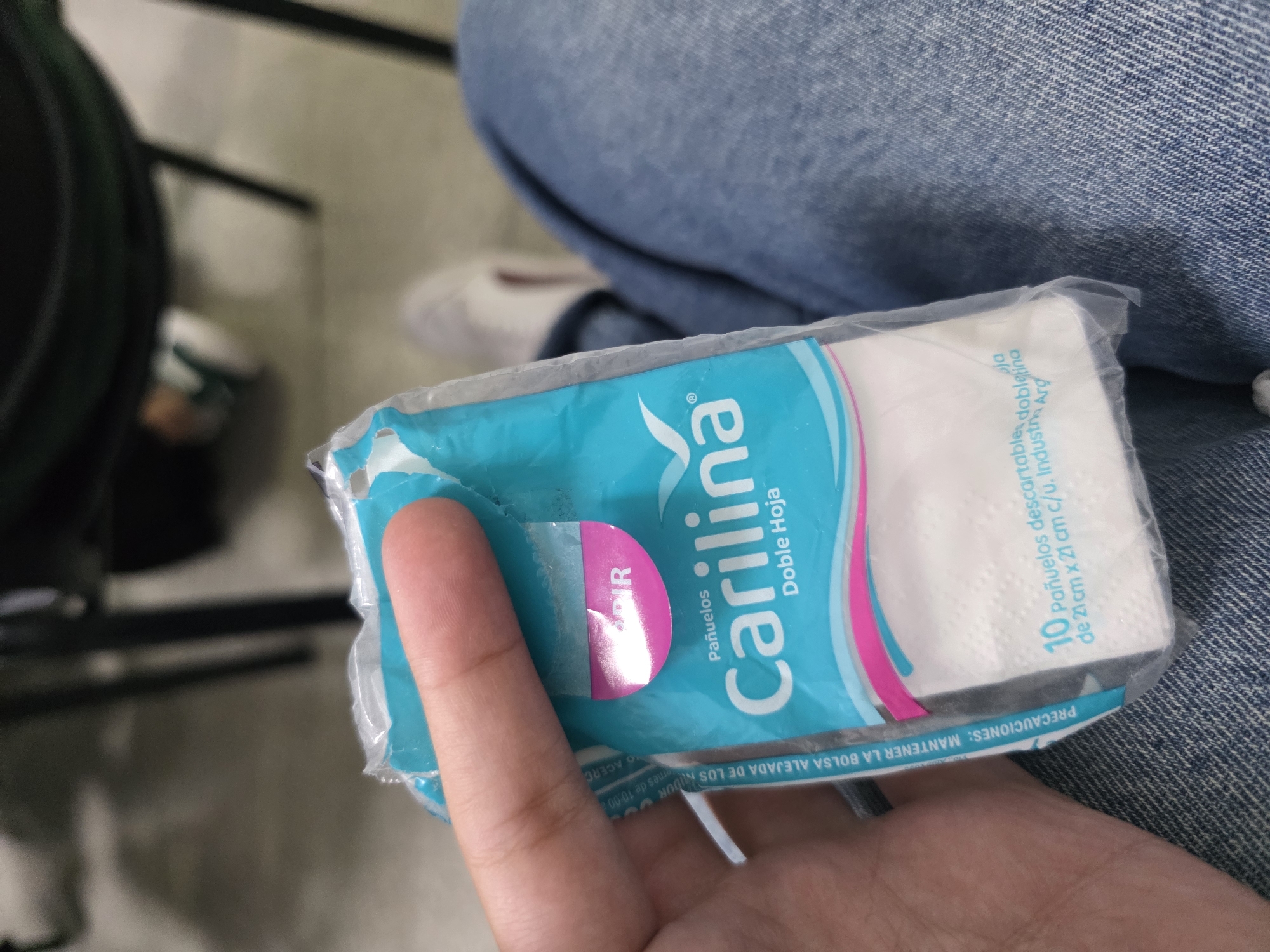 The scene is an indoor setting within San Fernando del Valle de Catamarca, Argentina. A light-skinned human hand is prominently positioned, holding a rectangular packet of "Carilina Pañuelos Doble Hoja" (double-ply tissues). The packet is primarily light blue and white, displaying a pink pull-tab labeled "ABRIR" (Open) and text identifying the contents as "10 Pañuelos descartables de 21 cm x 21 cm c/u. Industria Argentina." The individual holding the tissues is seated, evidenced by the presence of blue denim jeans visible across the lower right quadrant and bottom edge of the frame. A light-colored shoe is partially visible on the floor in the lower right, beneath the jeans. The background is out of focus, revealing a light-toned floor surface and blurred dark objects consistent with furniture, such as chair or table legs.