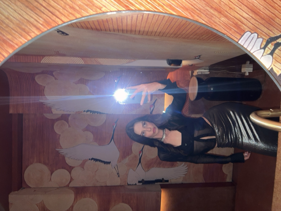 A female subject with long, dark hair is depicted in a mirror selfie taken in an indoor setting in Tibubeneng, Indonesia. She is wearing a black sheer long-sleeve top over a black bandeau or camisole, a metallic silver pleated skirt, and a prominent silver-toned choker necklace. Her right hand holds a smartphone, from which a bright flash emanates, creating a central glare. The reflection shows a large, irregularly shaped mirror with a visible wooden frame or border. The wall behind the subject features patterned wallpaper depicting stylized white cranes with red accents amidst light-colored circular motifs on a textured, reddish-brown background with horizontal striations. Reflected elements to the left include a warm, orange-toned light fixture above a brown upholstered bench. To the right, a dark cylindrical stool or waste bin stands above visible white electrical outlets and wiring. A golden-colored faucet is reflected in the lower foreground, suggesting the presence of a sink.