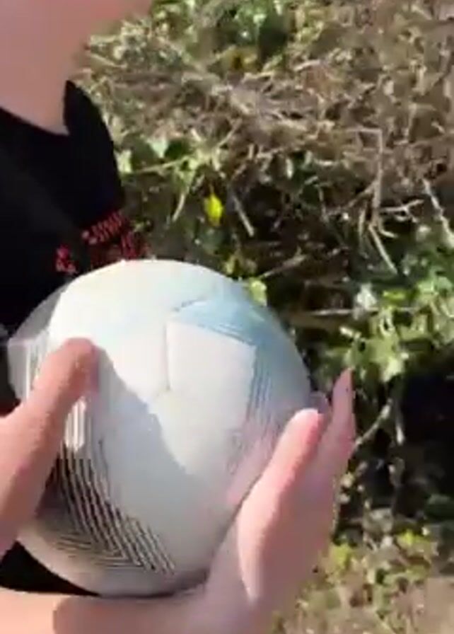 A young, light-skinned person with short hair and glasses, wearing a black t-shirt and khaki pants, is walking along a path in what appears to be a park or playground. They are carrying a white and blue soccer ball. The person is smiling and looking towards the camera at times. The background includes green grass, trees, and wooden fencing. In one shot, a red structure is visible in the distance. They walk past the fencing, presumably towards the playground or park area. They have a black strap or bag slung over their shoulder. The lighting suggests a bright, sunny day.