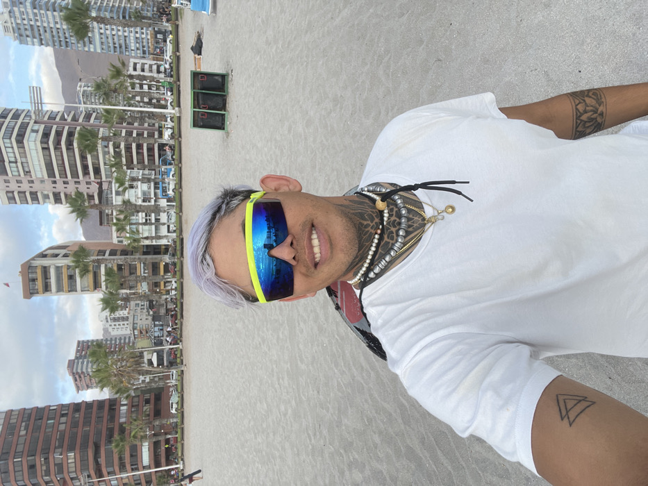 A tattooed man with greyish hair wears neon yellow and blue sunglasses on a beach. He sports several necklaces and a white t-shirt. Behind him are tall buildings, palm trees, and speakers. The sandy beach stretches out, with a cloudy sky above. A small geometric tattoo is visible on his arm.