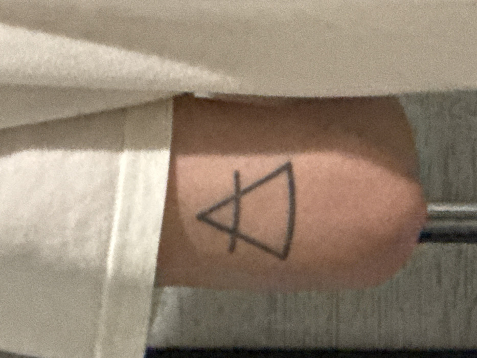 The scene is located in Budva, Montenegro. The image presents a close-up, static view of a human arm, likely a forearm or bicep, displaying fair skin tone. A distinct tattoo is centrally visible on the skin. This tattoo is a black line-art design featuring an upright equilateral triangle. A horizontal line segment bisects the upper third of the triangle, connecting its two longer sides. The lines of the tattoo are solid and appear uniform in thickness. A light-colored, possibly off-white or cream, fabric garment partially obscures the arm, visible at the top and along the right edge of the frame; this fabric exhibits subtle texture, consistent with a sleeve. The immediate background to the left and below the arm is out of focus, appearing as a blurred gray surface with faint horizontal striations. A thin, vertical, metallic rod-like object is partially visible at the bottom center of the frame, originating from below the arm. Direct lighting illuminates the left side of the arm and tattoo, casting a soft shadow across the right portion of the arm and the adjacent garment, indicating a light source positioned to the left of the depicted scene. No explicit actions or interactions are observed.