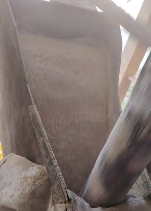 close-up of a mixing process inside a large container. A blunt, angled arm repeatedly rotates within the container, stirring and mixing its contents, which appear to be a fine, light-colored, grainy substance. The interior of the container is rough and textured. The environment seems to be outdoors with natural light.