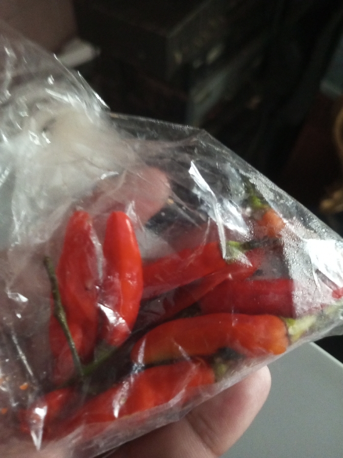 - "A hand holds a clear plastic bag filled with several small, bright red chili peppers" by FM-zA7uI2, licensed under CC BY 4.0