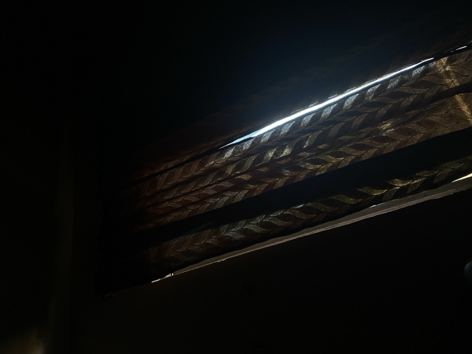 An interior scene in Narayi, Nigeria, features two vertical curtain panels. These panels are constructed from a dark fabric, patterned with recurring lighter, wavy or leaf-like motifs. A narrow, prominent vertical beam of bright external light penetrates the space through an incomplete closure between the two curtain panels, illuminating the pattern on the fabric and creating strong contrast. The majority of the surrounding room is obscured by deep shadows. No individuals or additional distinct objects are identifiable within the frame.