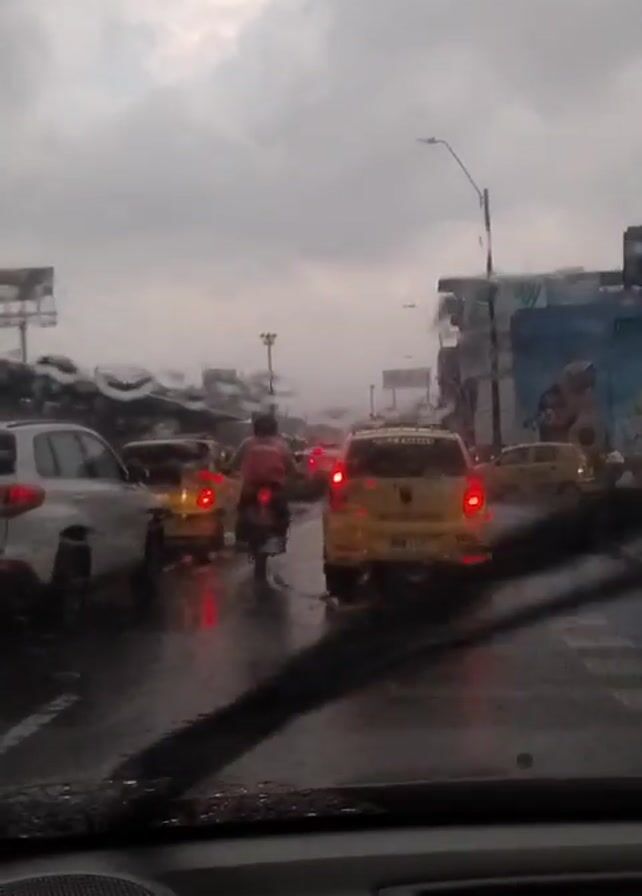 scene of a city street with heavy traffic during a rainstorm, as viewed from inside a car