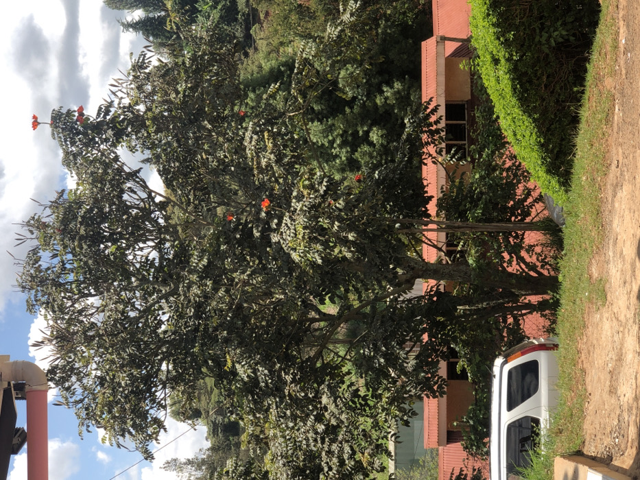 The image presents an outdoor scene located in Nyeri, Kenya, under a partly cloudy sky. A large tree with dense, dark green foliage and multiple bright orange, cup-shaped flowers dominates the central and upper-mid portions of the frame. Elongated, dark brown seed pods are visible at the top of this tree. In the immediate foreground, a dirt path with patches of dry grass is present. The rear section of a white sport utility vehicle (SUV) is parked on this dirt path in the lower left quadrant. To the lower right, a manicured, bright green hedge forms a diagonal line across the frame. Behind the central tree and the hedge, multiple single-story buildings with light-colored walls and corrugated orange-red roofs are partially visible. The background consists of dense, green vegetation, including various trees and shrubs, suggesting a hilly and lush environment. A light-colored roof overhang with a pink downspout is visible in the upper left corner. No individuals are present in the depicted scene.
