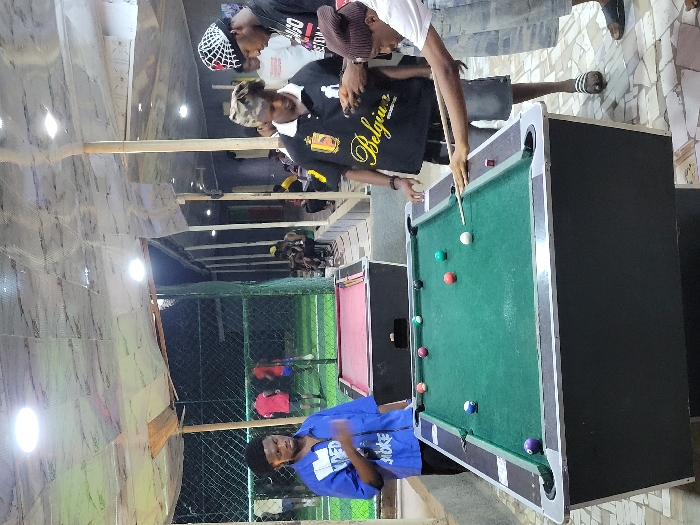 Several people are playing pool in an indoor/outdoor setting. A group focuses on one table, one person poised with a cue stick. Another individual stands beside the table, observing. Pool tables line up, with some individuals in the background. The building has a makeshift appearance with exposed beams and supports. The lighting is bright but unevenly distributed.