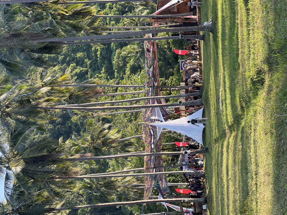 The scene depicts an outdoor gathering or festival situated in a palm grove within the city of Thong Nian, Thailand