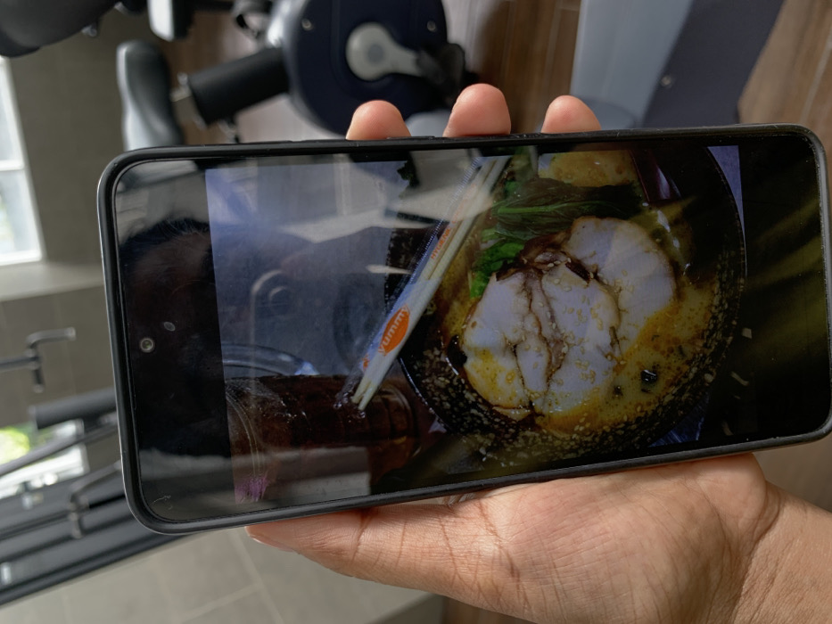 A hand holds a smartphone displaying a photo of ramen. The ramen features a large cut of pork, green vegetables, and a sesame-speckled broth in a dark bowl. Wrapped chopsticks are visible. A blurred reflection on the phone screen shows a person and exercise equipment. The background of the overall image includes a window, wall, and additional exercise equipment.