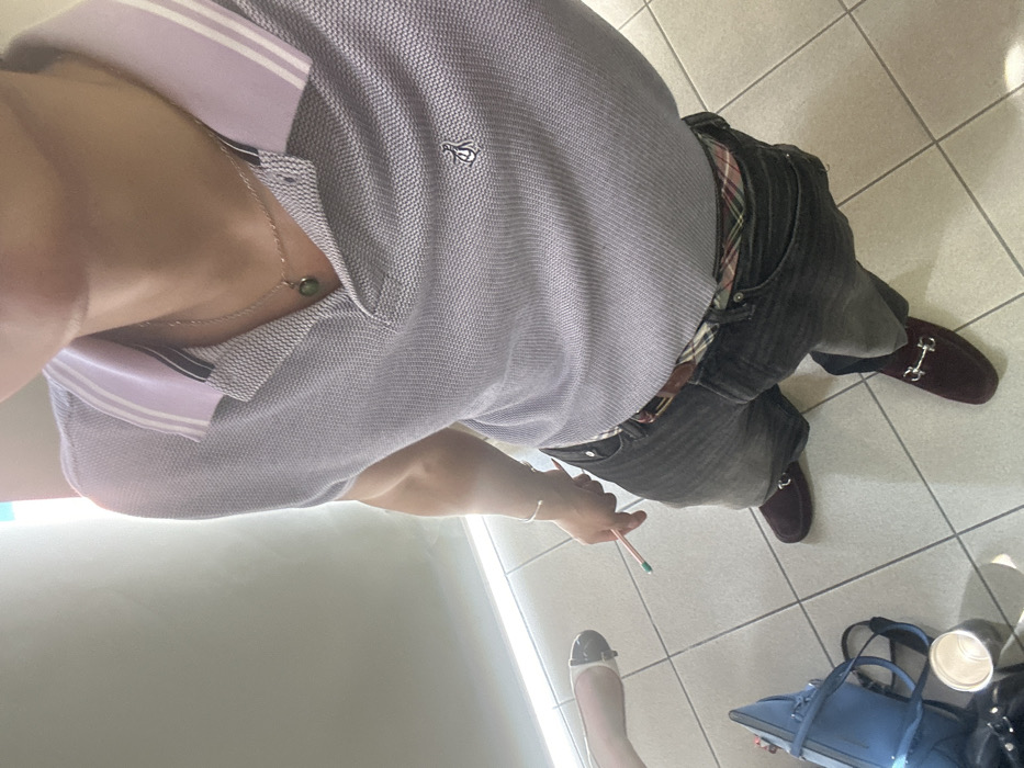 The image depicts an indoor scene from an elevated perspective, focusing on the lower torso and legs of a primary subject. This individual wears a light purple short-sleeved polo shirt with a contrasting striped collar (light purple, white, and dark blue/black) and an "Original Penguin" logo on the left chest. A silver-colored chain necklace with a dark green circular pendant hangs from their neck. Their right wrist is adorned with a silver-colored bracelet, and their right hand holds a green-tipped pencil or pen. They wear dark grey jeans, secured with a plaid belt featuring red, green, white, and black colors, and burgundy suede loafers with silver-colored horsebit details. To the lower left, a second person's foot, wearing a black and white flat shoe, is partially visible. On the floor nearby are a light blue tote bag and a silver-colored can or cup. The environment features a light-colored tiled floor with visible grout lines and a plain, light-colored wall with a horizontal light fixture or trim along the base. The precise location within Mexico City, Mexico, cannot be determined from the visual information, but it is an interior, presumably commercial or public, space.