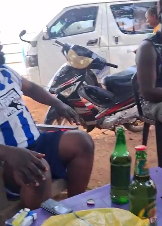 A man wearing a black tank top, jeans, and a cap is sitting at a blue plastic table outside with three bottles of Hero beer on it. To his left, there's another person in shorts, partially visible. A motorcycle is parked beside them, and a white van is in the background. A woman in a yellow shirt is walking around the van. The camera then shifts to another man wearing a blue and white striped shirt and navy shorts, sitting on a wooden chair under a tree. He appears to be listening to someone. The same woman in yellow is seen in the background. A basic mobile phone lies on the table beside him. The setting appears to be a casual outdoor gathering.