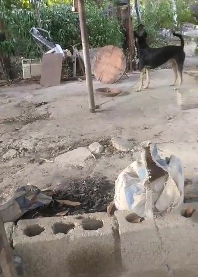 The scene appears to be under a partially covered outdoor structure, likely a shed or carport. The ground is dirt and concrete, cluttered with various objects: a wooden spool, scattered metal pieces, and some damaged bags or sacks resting against a block structure. A dog, predominantly black with tan markings on its legs and a white-tipped tail, is standing in the middle of the area. The dog barks once, jumps straight up in the air, and then turns its back to the camera. The background reveals greenery, suggesting a yard or garden area behind the structure. The lighting is diffused, indicating overcast conditions. The camera is stationary and at a medium distance from the dog.