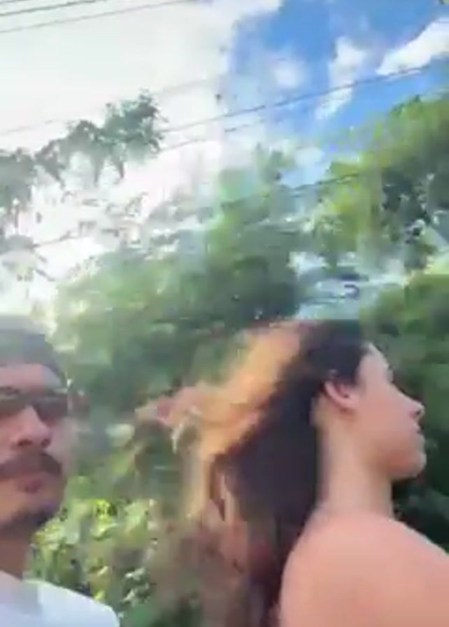 The video, shot from a moving vehicle, shows two people riding along a narrow road